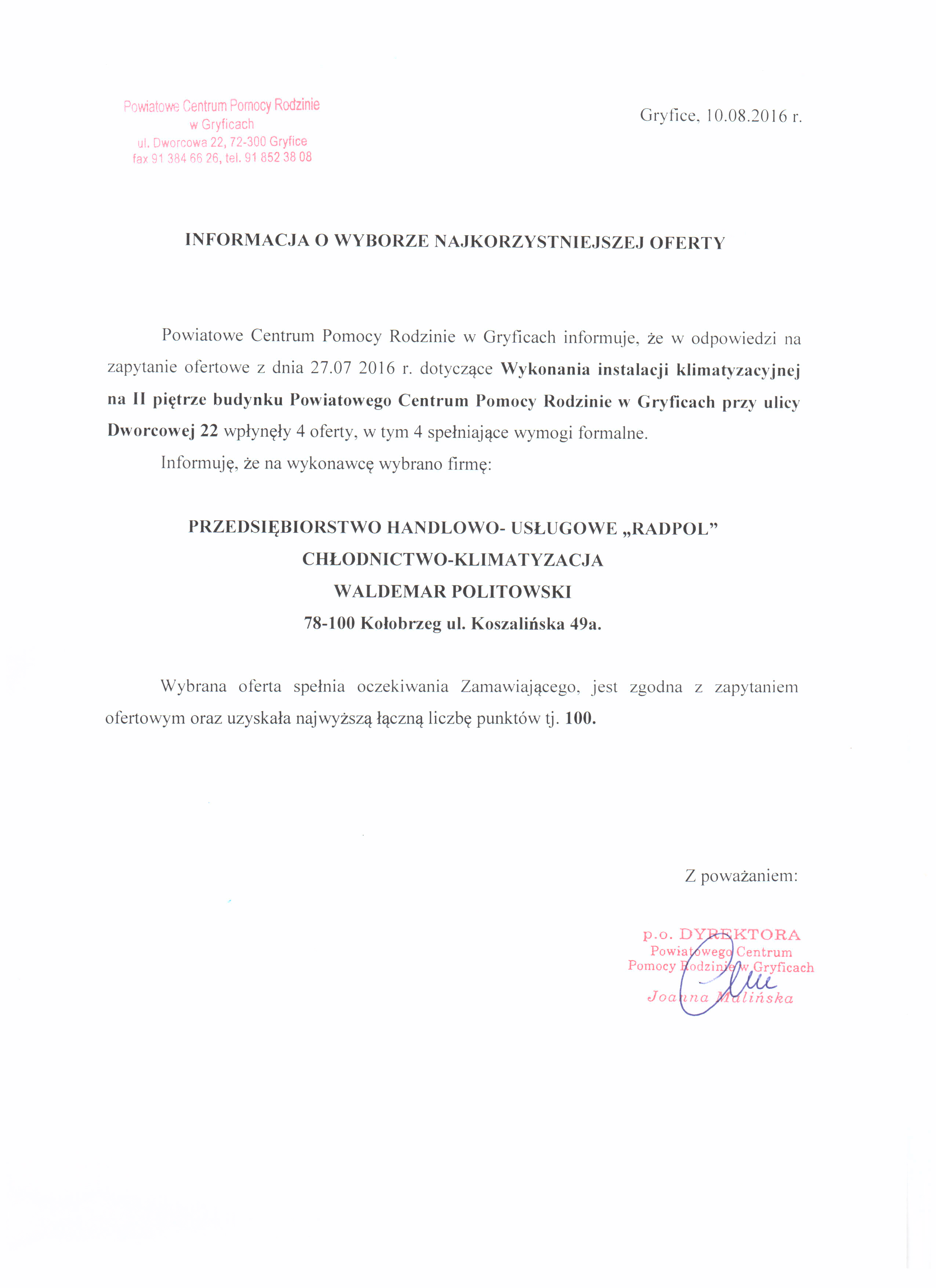 INFORMACJA O WYBORZE NAJKORZYSTNIEJSZEJ OFERTY